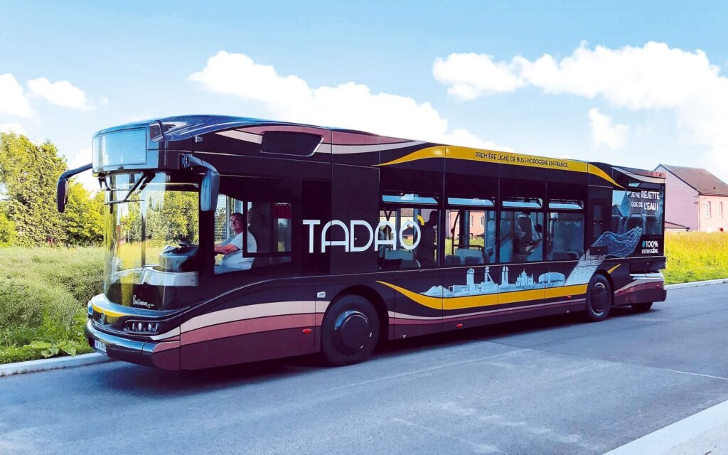The month of September saw the opening of several hydrogen bus lines after those of this summer. The cost of purchasing these buses is however twice as high as that of an electric bus. The first hydrogen bus entered service in France last June in Houdain, for the agglomeration of Artois-Gohelle, in Pas-de-Calais. The Businova H2, designed by the Albigensian company Safra, with Symbio for the fuel cell, combines an electric battery with an fuel cell which transforms hydrogen into electrical energy. Thirty kilos of this gas are stored in tanks placed on the roof. It thus has a range of 300 km per day for a charging time of only 15 minutes. Five other buses will be delivered on this line. A hydrogen production, storage and distribution station (Engie, Gnvert, MCPHY) was installed on the carrier’s website, opposite the buses maintenance workshops. The Île-de-France is experimenting for the operation of two Van Hool hydrogen buses between Jouy-en-Josas-Gare and Versailles-Chantiers (12 km), a journey taken by 1,000 travelers daily. These buses have a range of 300 km thanks to a tank of five bottles for 39 kg of hydrogen. The recharging is ensured at Air Liquide station. The objective is to test the performance of this type of vehicle: consumption, operation, maintenance costs and technical holding. This experience is funded by the Region (59 %), by the Versailles Agglomeration Community (9 %) and by the European 3emotion program (32 %).